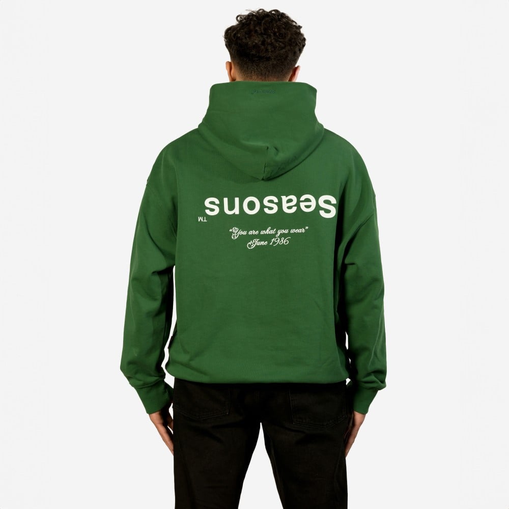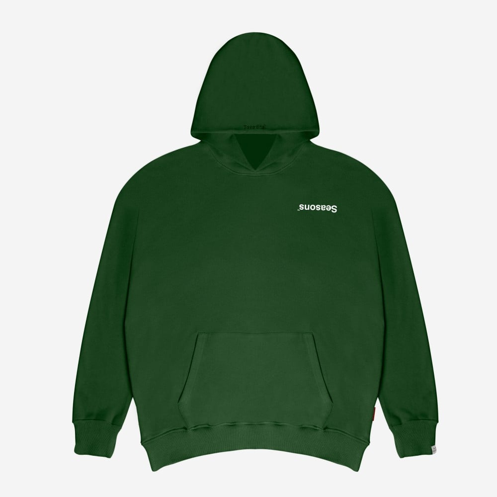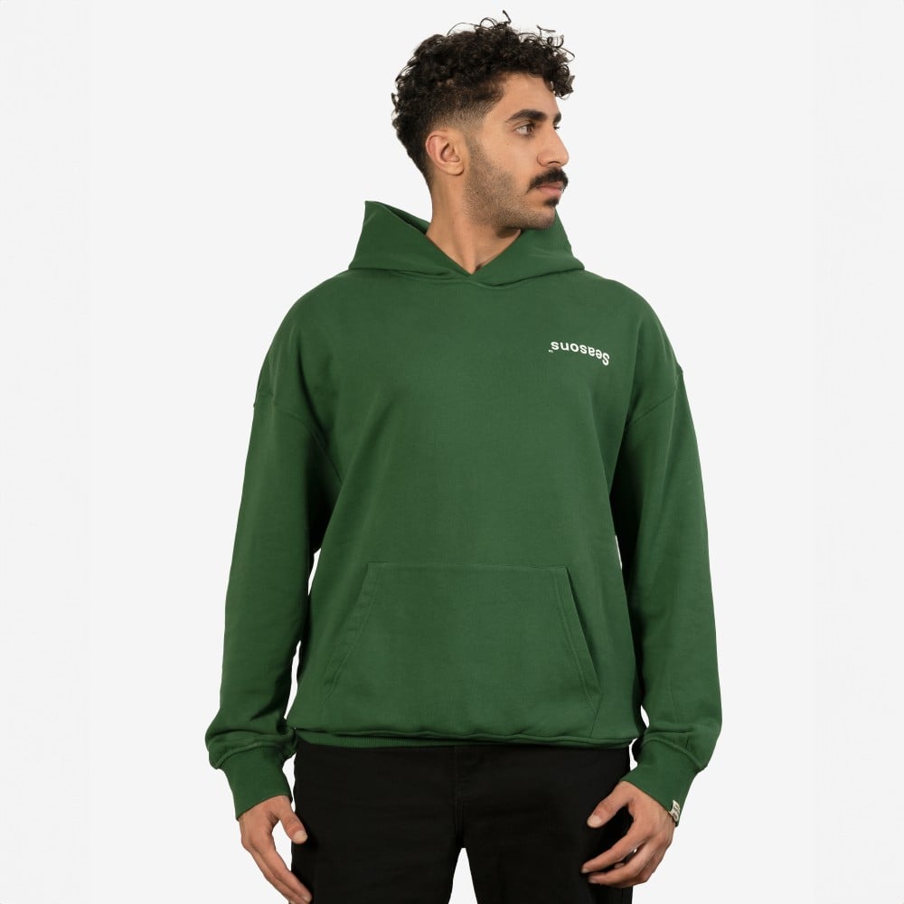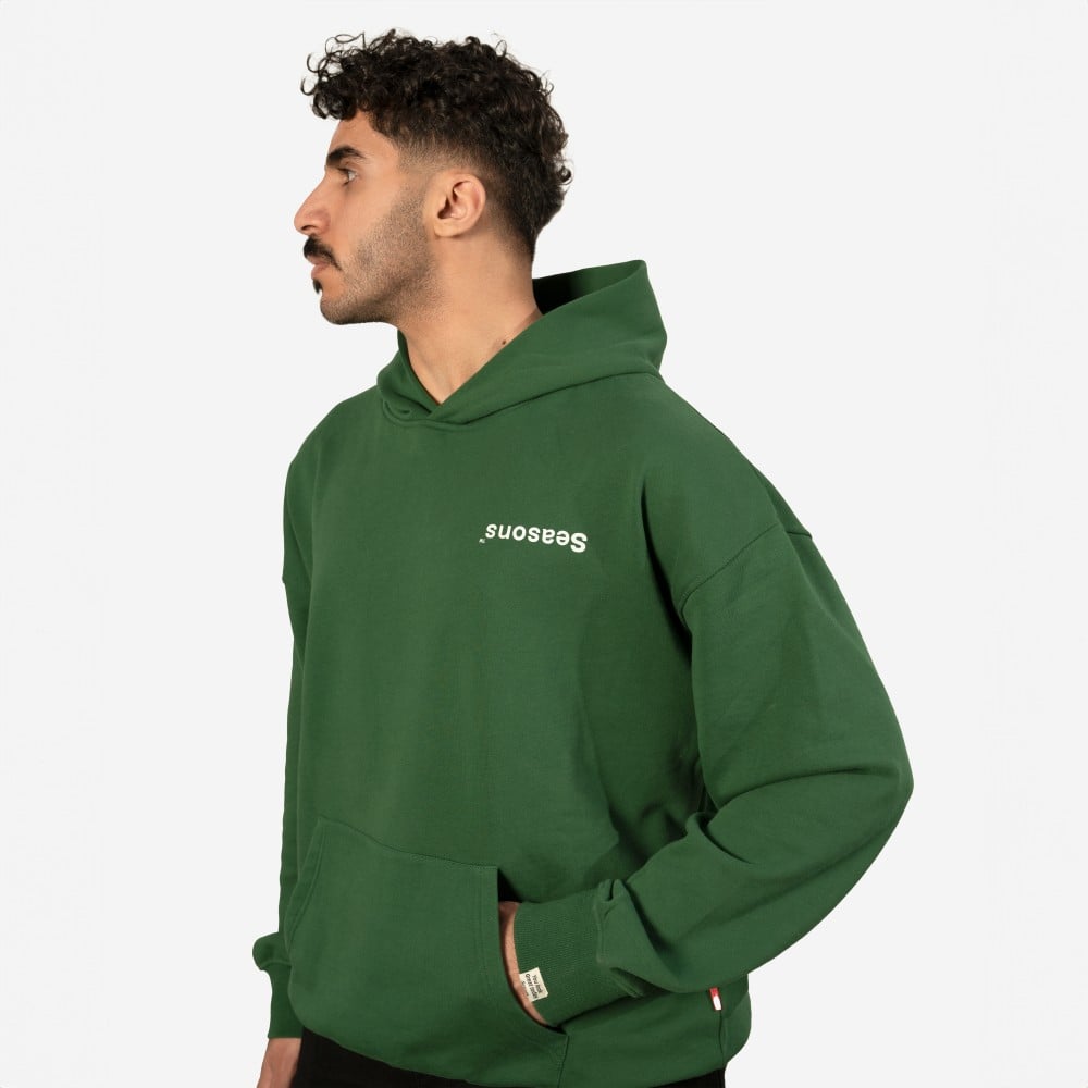 لون أخضر عميق بستايل ستريت وير نظيف. على الصدر طباعة صغيرة لشعار seasons مقلوبة بشكل لافت، وفي الظهر طبعة أكبر مع عبارة بخط كلاسيكي تضيف لمسة فنية.