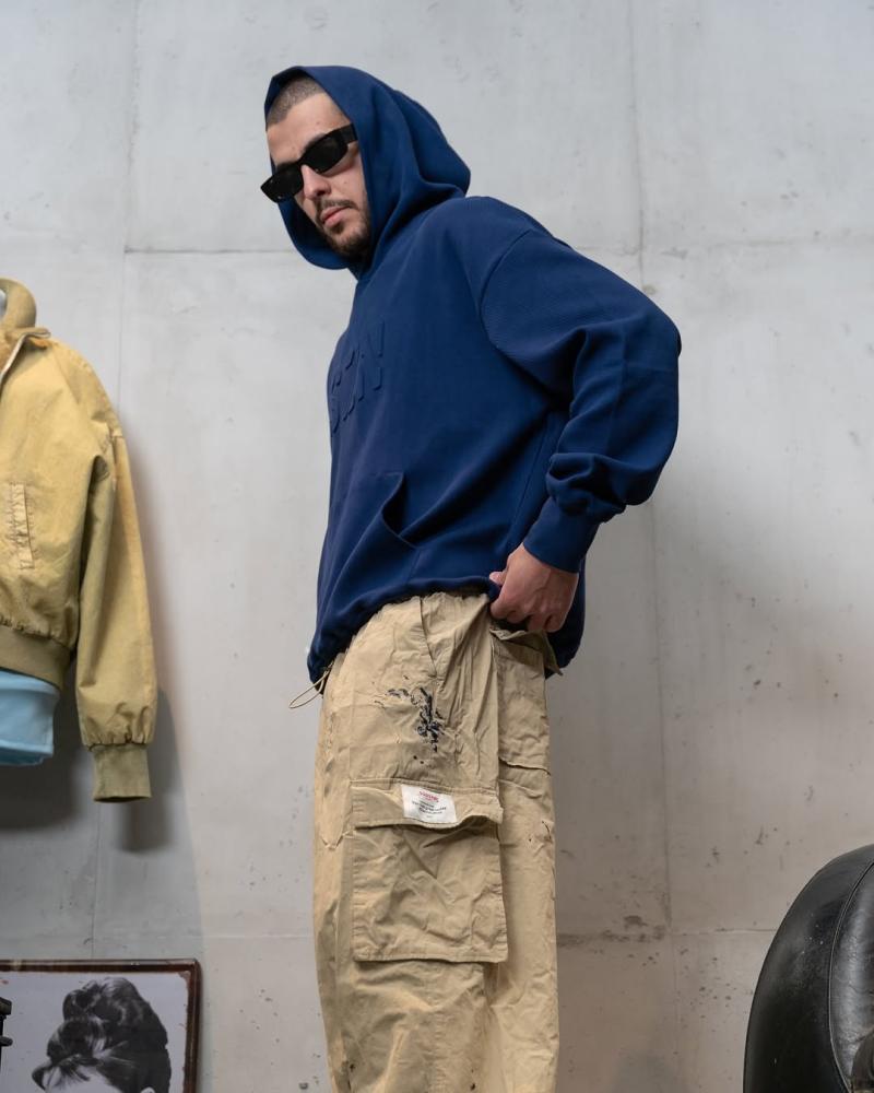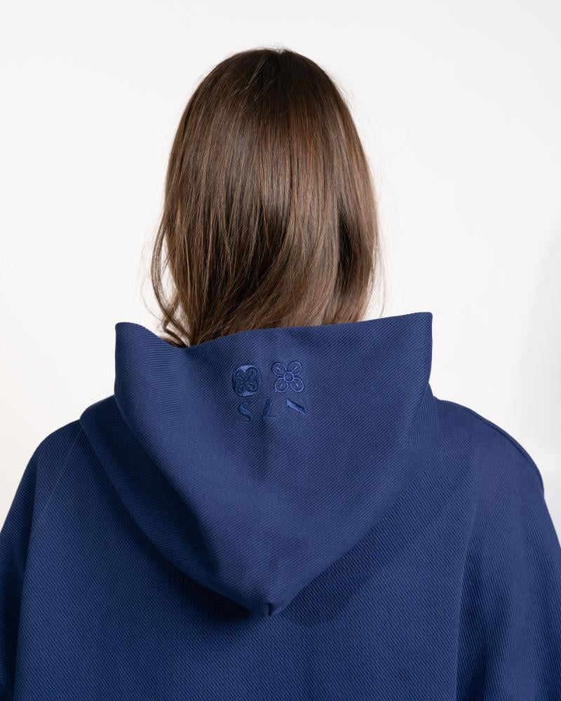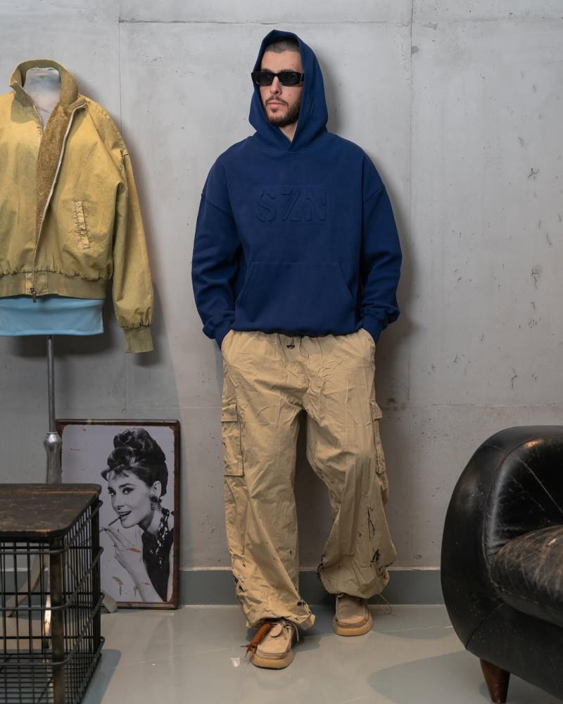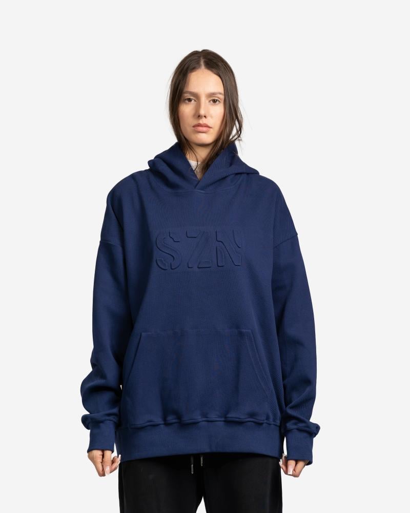 The SZN hoodie in navy blue is clean, streetwear with a minimalist touch. The relaxed/oversized fit features a dropped shoulder and the SZN "ton-on-ton" embossed logo on the chest gives it a relaxed, relaxed feel. A comfortable, drawstring hood, a handy kangaroo pocket, and elastic cuffs and hem for added shape.